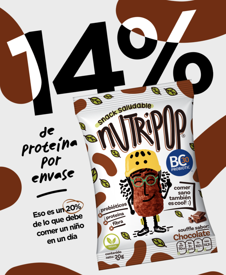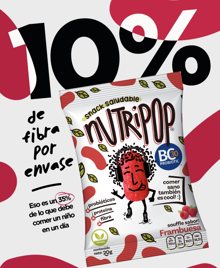 Con 10% de fibra por envase, Nutripop aporta el 35% de la fibra que un niño debería consumir al día. Una buena fuente de fibra favorece la digestión y el equilibrio intestinal, ayudando a formar hábitos saludables desde pequeños, de una forma simple y entretenida.