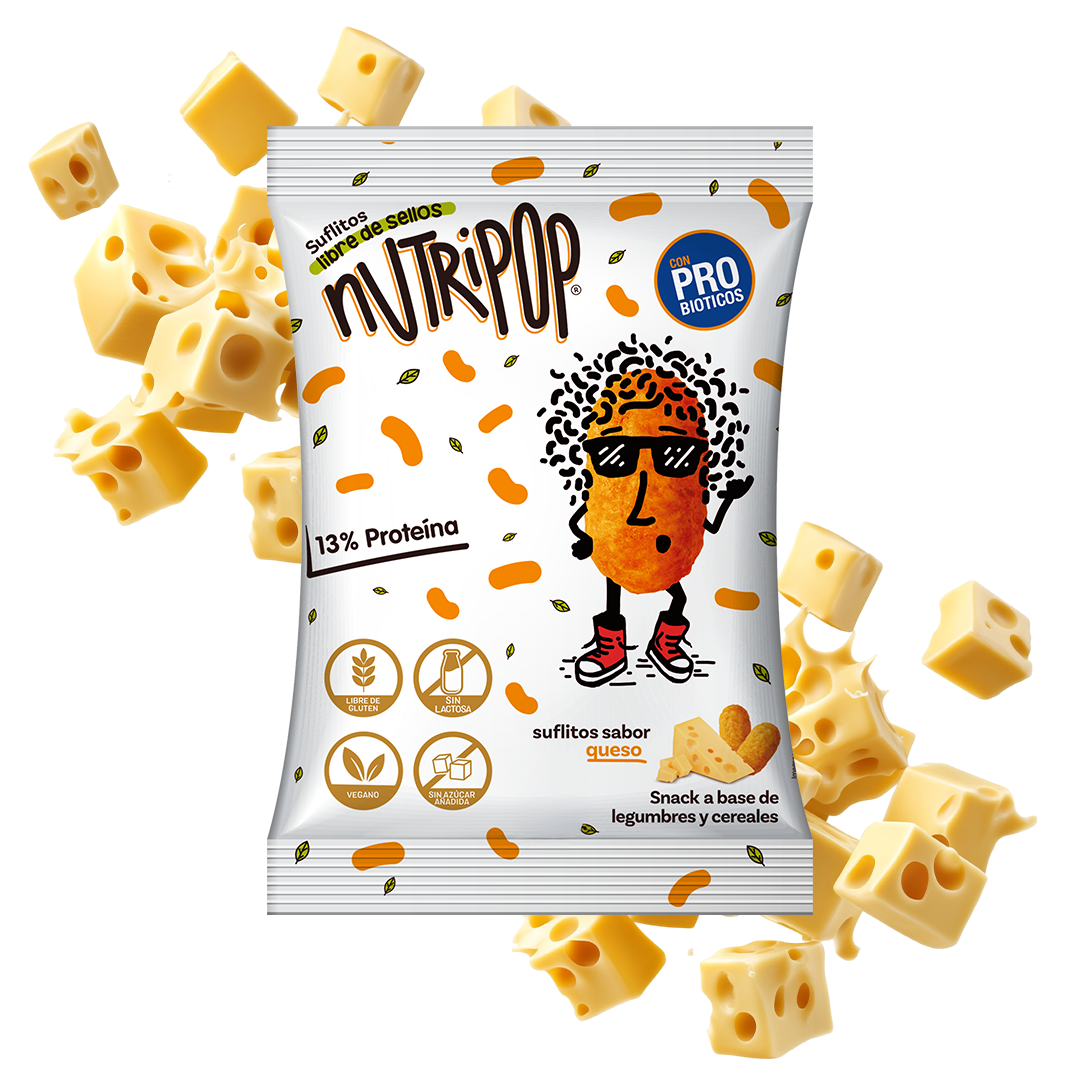 Súbele el volumen a lo saludable con los Suflitos Nutripop sabor Queso, un snack a base de legumbres, con probióticos vivos que ayudan a mantener el equilibrio de la flora intestinal y fortalecer el sistema inmune.
